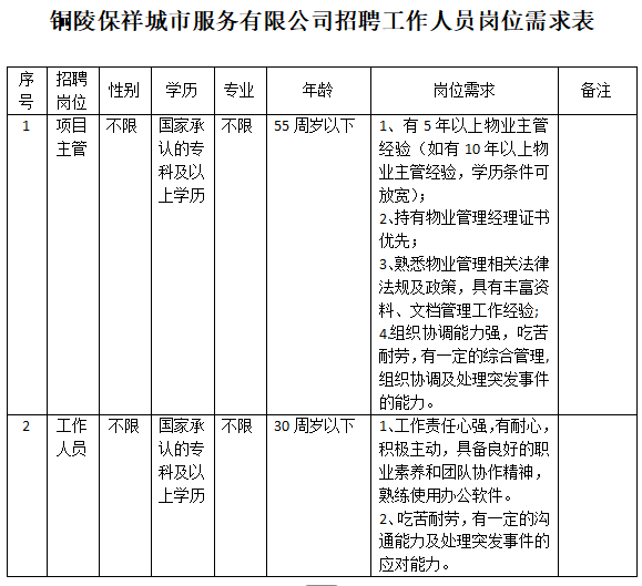 因業(yè)務(wù)發(fā)展需要,銅陵保祥城市服務(wù)有限公司面向社會(huì)公開(kāi)招聘工作人員2名。具體事項(xiàng)公告如下: