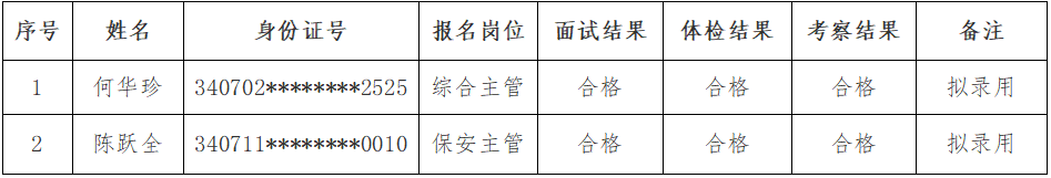 ? 根據(jù)《銅陵保祥城市服務(wù)有限公司招聘工作人員公告》規(guī)定,經(jīng)過報(bào)名、面試、體檢、考察等環(huán)節(jié),現(xiàn)將擬錄用人員公示如下(見附件)。